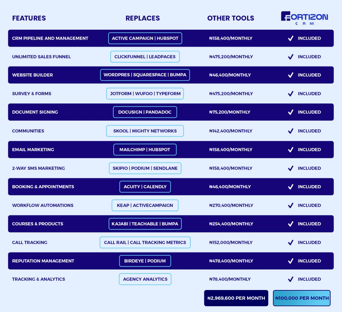 With Fortizon CRM, you don't need Shopify, Kajabi, Zoho, ActiveCampaign, Bumpa, BigCommerce, Calendly